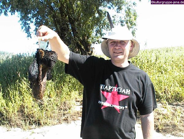 Markus präsentiert einen gefundenen toten Pinguin. Folge der Klimakatastrophe an der Elbe???