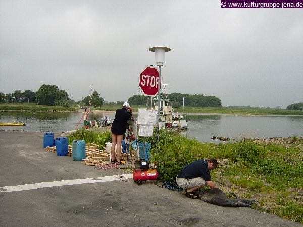 Der Meister arbeitet mit dem Kompressor, Trio mit dem Handy...